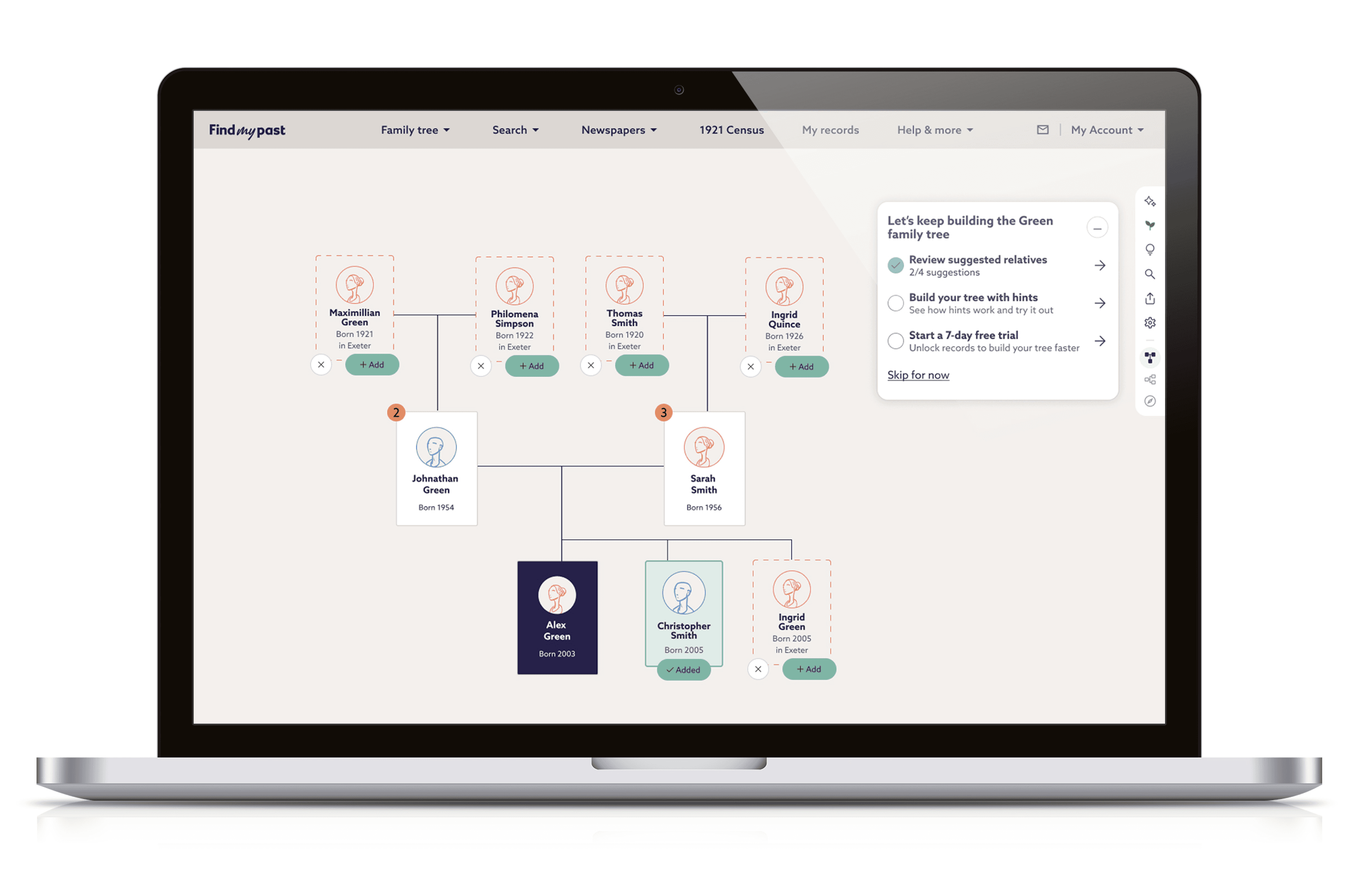TreeAssist suggestions relied on historical record matches, which meant the experience worked best for users with British ancestry, where record coverage was strongest.